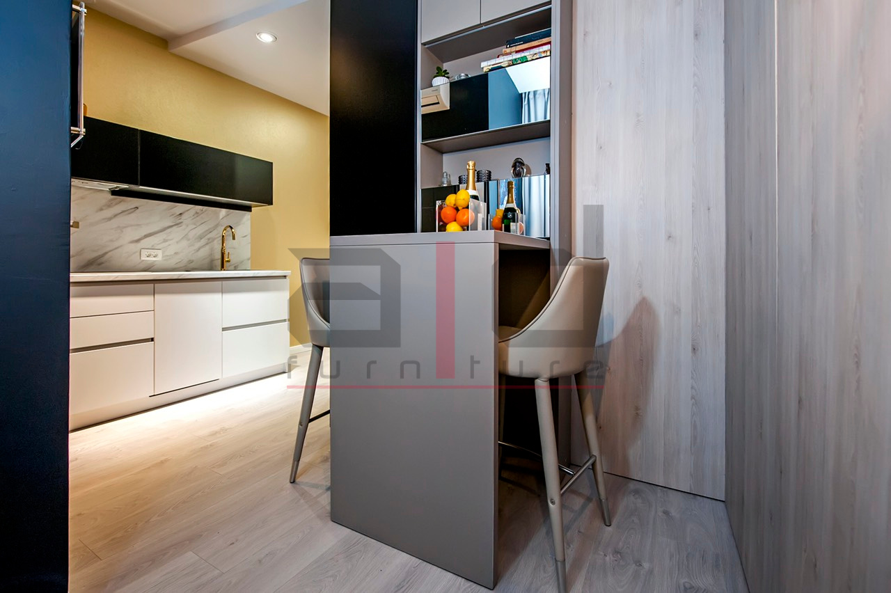 Bezvremenski stil namještaja, s naglaskom na multifunkcionalnost, idealno se uklopio u ovaj minimalistički prostor. U izradi smo koristili mdf-materijal, trajan i često korišten na tržištu te egger iverale i radne ploče.